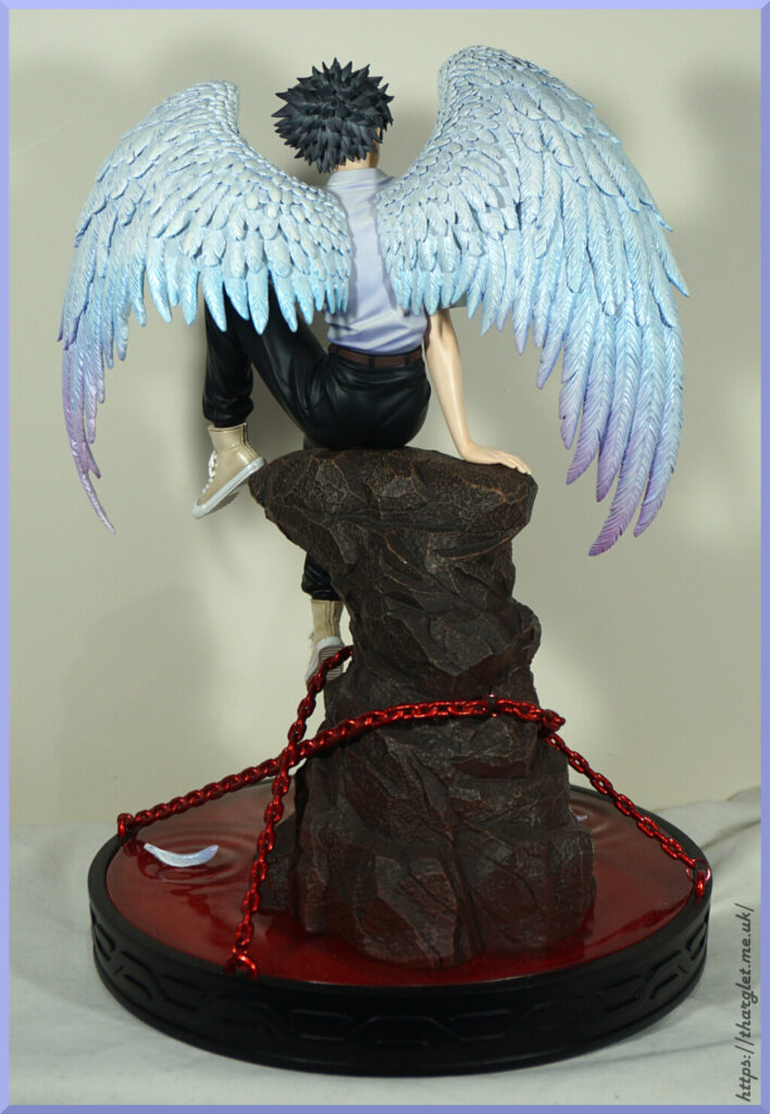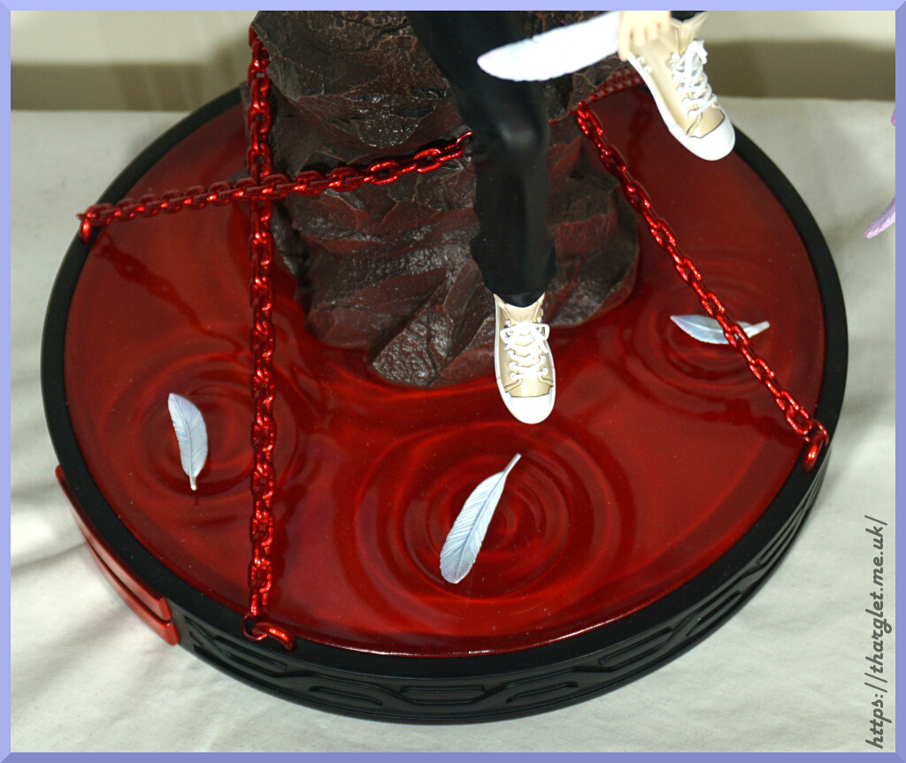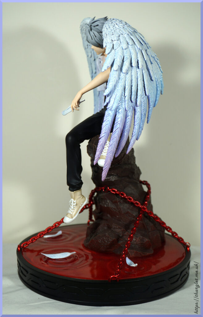With this figure it came in only four parts – the base, Kaworu himself and two wings – plus the four feathers. It was a breath of fresh air to have a resin statue that was simple to assemble. The base was a bit hard to get out of the packaging hole it was in – I’m not sure the EPE layers were glued quite right on mine. Otherwise assembly was a breeze. Did have some confusion of where each feather was supposed to go, but decided to go with my own configuration – the most curved one is supposed to go on the chain and the one his hand is supposed to be in one of the LCL splashes. However, I put the feather in his hand and it looked right there so I stuck with it. The feather did at first wedge in there but eventually fell out and wouldn’t stay so I got my own tack to keep it in place.