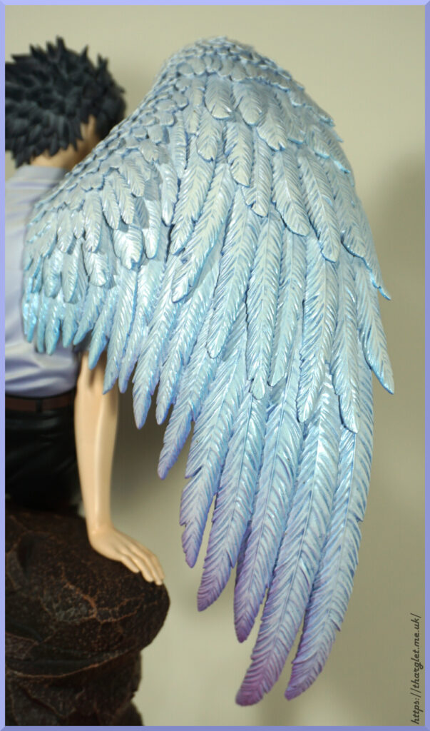 A lot of sculptwork went into the wings – each feather has its details sculpted, no half-assing here. They’ve even added in little bits of damage/ruffling. I love the way the wings have the purple fade at the tips. They’re a very nice pair of wings. Probably my favourite pair of feathered wings on a figure.
