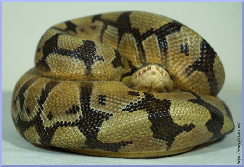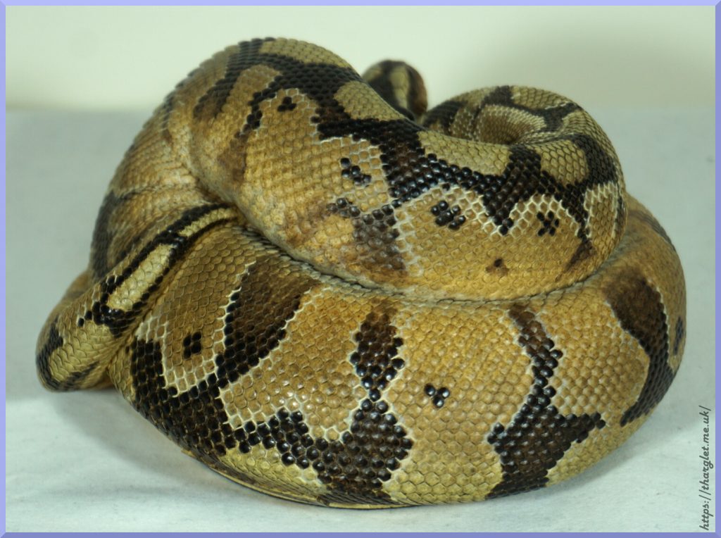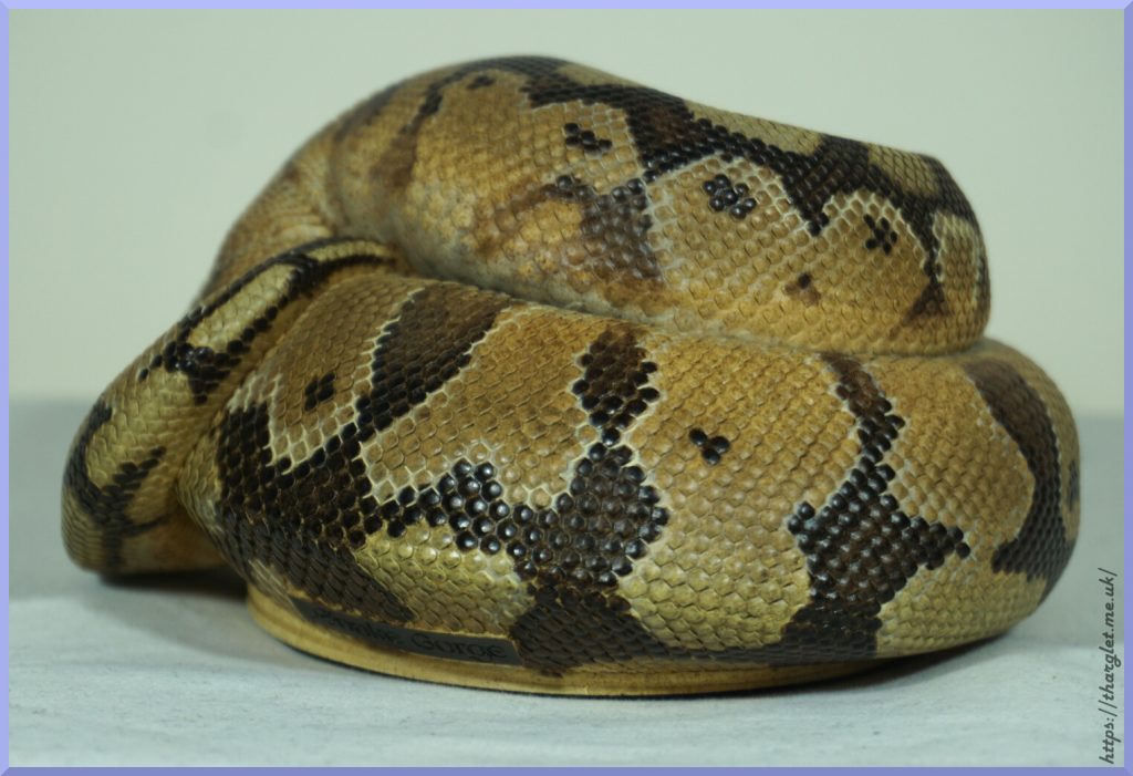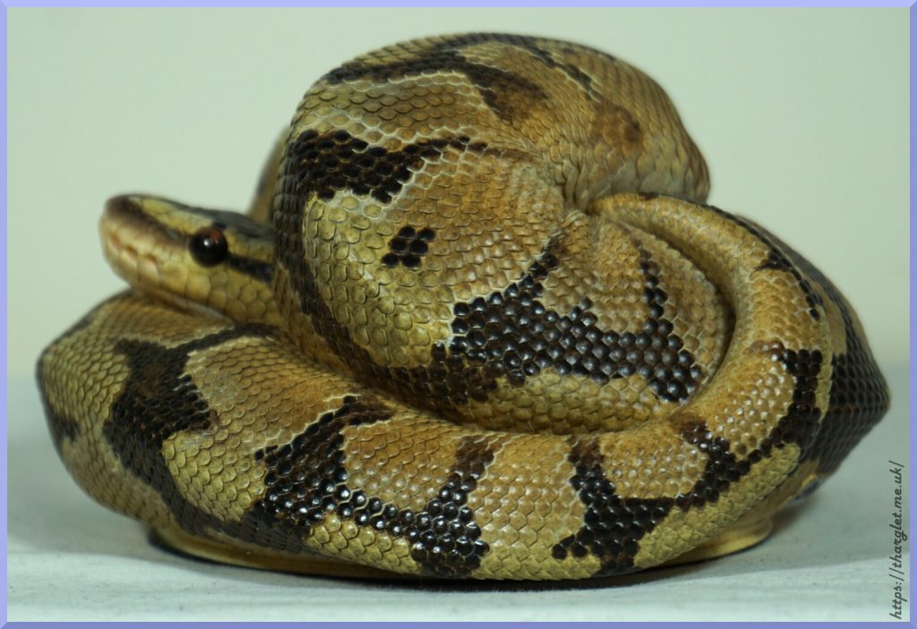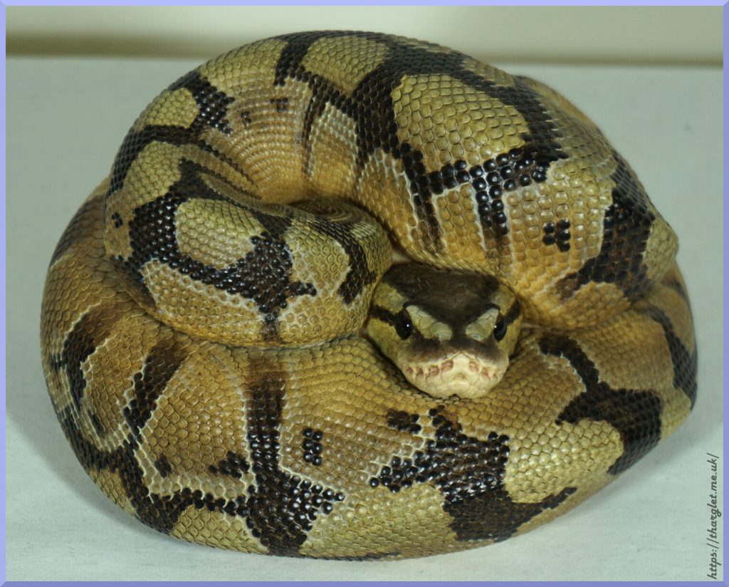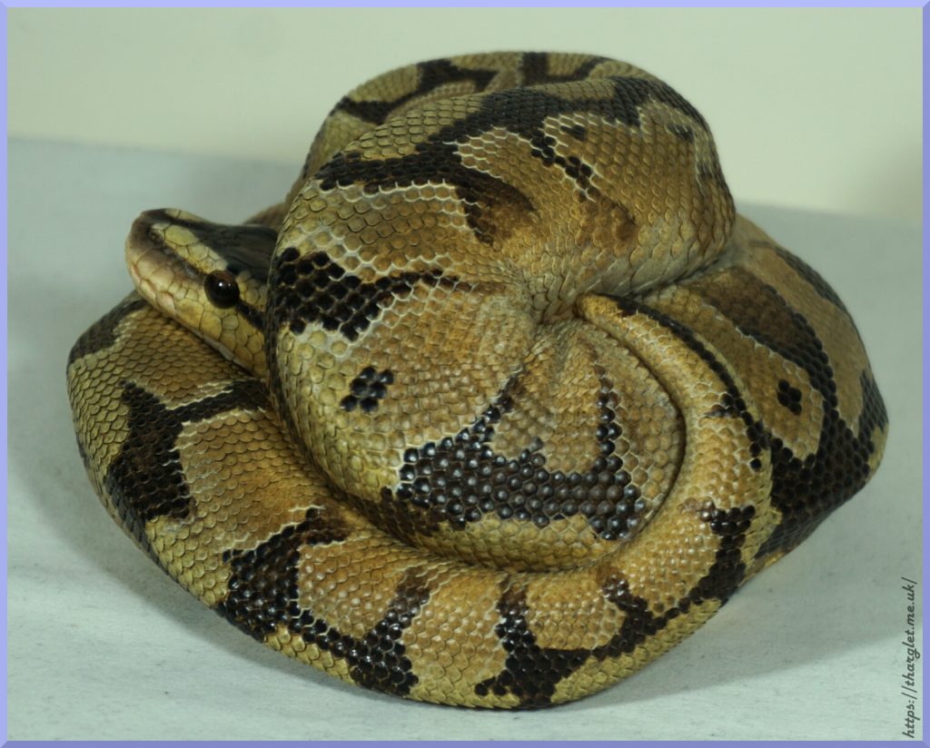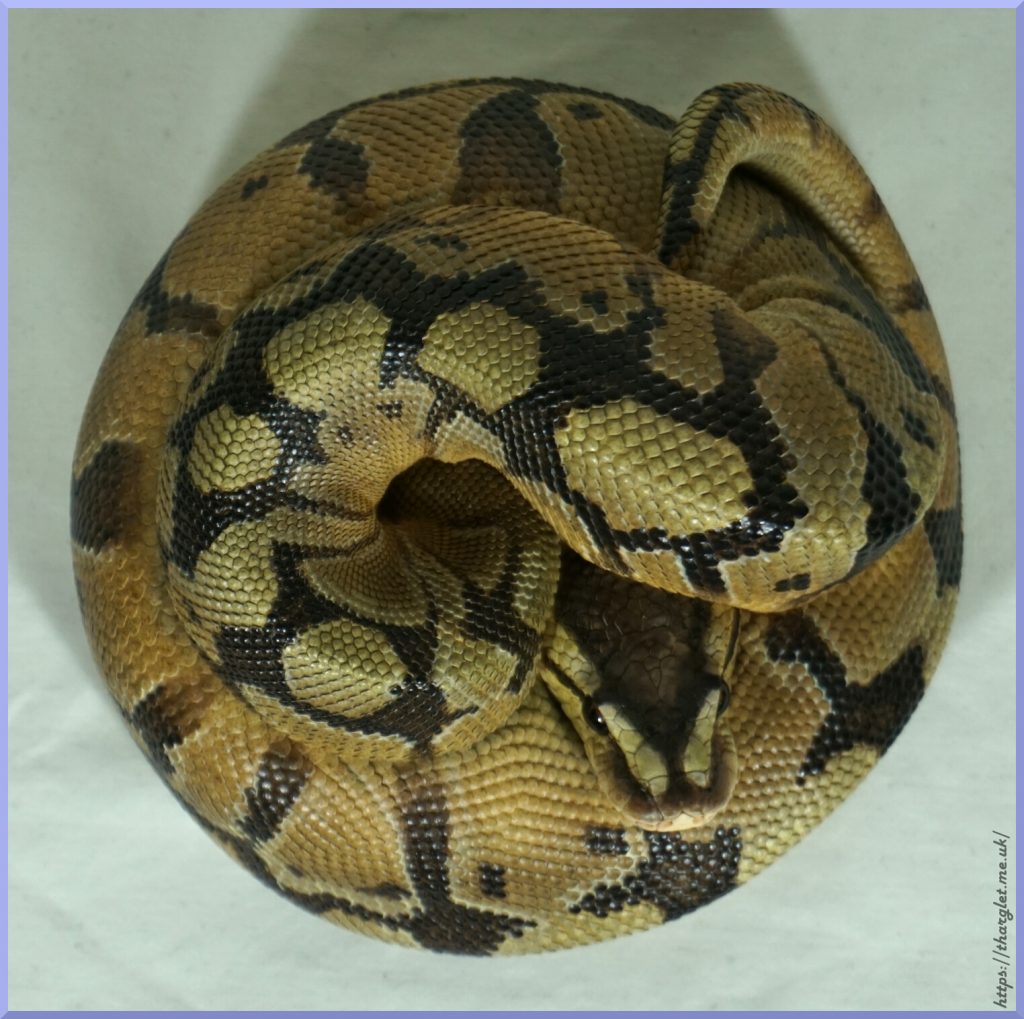 Yep, that’s definitely a ball python in a ball! Can definitely appreciate the pattern from this angle, and the way they’ve incorporated the colour fade into the head stamp. His head looks a lot like my pet python’s head.