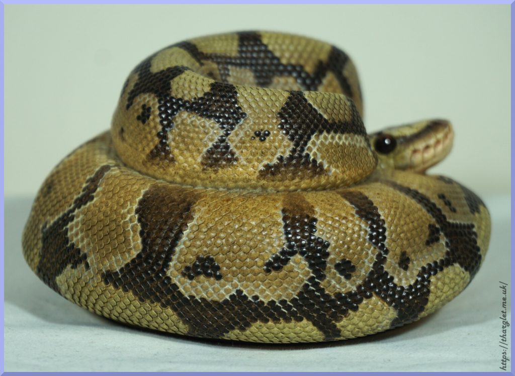 D’aww. Certainly looks the part with his cute face, heat pits and triangular body. At first I wasn’t so keen on the whitish areas between some of the scales, but this is part of the patterning of a ball. Can see my pet snake has these too. The painting is very precise – the patterns are sharp and keep to the scales.